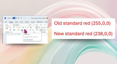 Стандартный красный цвет особенно часто используется в приложениях Office, как правило, для выделения некорректных данных или любого текста, требующего особого внимания. Он стал доступен клиентам Microsoft 365 в системах Windows версии 2411 (сборка 18324.20012) или более поздних, а также на Mac версии 16.92 (сборка 24120731) или более поздних.