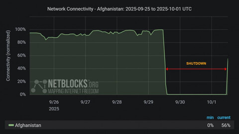 По данным организации по контролю за кибербезопасностью и Интернетом Netblocks.org и статистике сервиса Сloudflare Radar, в Афганистане зафиксировано частичное возвращение интернет сервисов после 48 часов полного отключения доступа в сеть интернет на всей территории страны с населением в 43 млн человек.