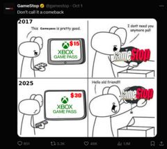 Microsoft вчера вызвала недовольство игроков после повышения стоимости подписки Xbox Game Pass Ultimate с $19,99 до $29,99 в месяц. Пользователи сразу начали жаловаться в соцсетях, а сайт Microsoft даже кратковременно «упал» из-за большого количества желающих отменить подписку. На этом фоне GameStop присоединился к обсуждению, разместив в социальных сетях мемы и напомнив, что у него по-прежнему продаются карты Game Pass по старой цене $19,99.
