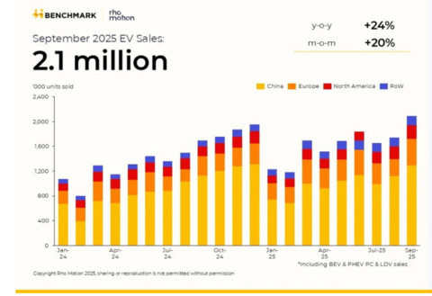 Мировой рынок электромобилей достиг исторического максимума в сентябре 2025 года: впервые за месяц продано 2,1 миллиона единиц, что стало следствием рекордного спроса на основных рынках. Общие продажи с начала года (январь-сентябрь 2025) достигли 14,7 миллиона электромобилей, что на 26% больше, чем за аналогичный период 2024 года.