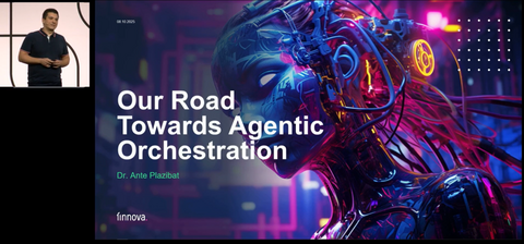 Сразу после кейноута Рюккера на сцене выступил Анте Плазибат, руководитель направления Emerging Business & Innovation в Finnova. Finnova — швейцарский вендор core-банкинга, обслуживающий более 100 банков; вчера мы уже слышали Анте в открывающем докладе Якоба. Сегодня — глубокий разбор того, как Finnova внедрила своё решение на базе агентной оркестрации.