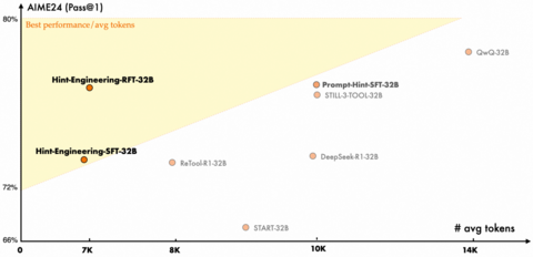 Во время обучения в текст рассуждения вставляются подсказки вроде «давай используем Python» или «проверка не требуется». Такой подход называется Hint-Engineering. Точность в математике выросла на восемь процентов, а количество использованных токенов сократилось почти наполовину.