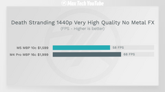 При этом заряд ноутбук на М5 держит в разы лучше: к концу тестирования у него осталось 34%, а у MacBook Pro на М4 Pro — 9%. С другой стороны, FPS в Death Stranding (1440р, Very High Quality, No Metal FX) был на М4 Pro на 17% выше, чем на М5.