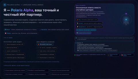 Кроме того, у Polaris Alpha визуальный стиль похож на стиль GPT-5. Вот что модель выдала на запрос «Создай одноэкранный html-файл со своей презентацией»: