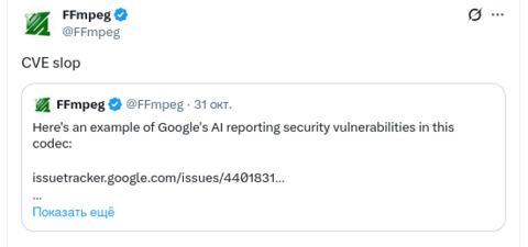 Команда FFmpeg (открытого фреймворка для обработки видео в Google Chrome, Firefox, YouTube и других основных платформах) призвала Google либо профинансировать проект, либо прекратить обременять своих добровольцев-методистов уязвимостями безопасности, обнаруженными с помощью инструментов искусственного интеллекта компании. Разработчики исправили некоторые ошибки, обнаруженные ИИ-агентом Google, но назвали обнаруженную такие уязвимости «CVE-slop» (CVE-шлакотстой).