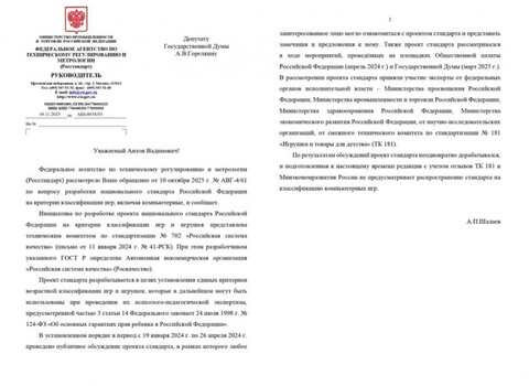 Организация развития видеоигровой индустрии (РВИ) рассказала, что ГОСТ для компьютерных игр не разрабатывается. РВИ сослалась на ответ Роскачества депутату Антону Горелкину. Депутат направил официальный запрос в Росстандарт. Ведомство ответило на запрос Антона Горелкина, что инициатива по разработке проекта национального стандарта на критерии игр и игрушек была представлена 11 января 2024 года. Далее было проведено публичное обсуждение проекта, рассмотрение в рамках мероприятий на площадках Общественной палаты и Государственной Думы.