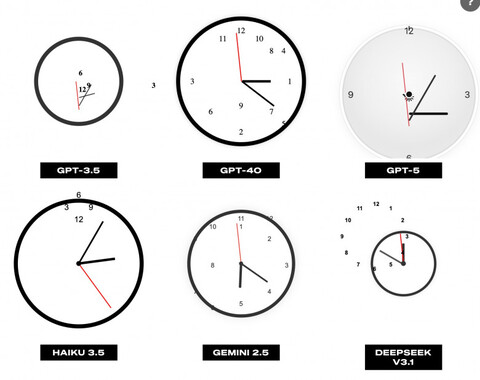 Брайан Мур запустил бенчмарк AI World Clocks, в котором девять ИИ разных поколений — от GPT-3.5 до Grok 4 и GPT-5 — пытаются создать в html часы с правильно показанным временем. К сожалению, задача оказалась не под силу даже лучшим моделям.