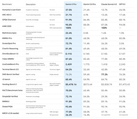 Несмотря на то, что официальный анонс Gemini 3.0 Pro еще не состоялся, на сайте Google уже случилась утечка карточки новой модели с основными характеристиками и цифрами по бенчмаркам (обновление: карточка удалена, характеристики и бенчмарки дальше пересказаны в новости, остальная часть описания была посвящена безопасности модели). Новая модель поддерживает контекстное окно до 1M токенов, а также выход до 64K токенов. В большинстве бенчмарков она показывает существенный прирост как в сравнении с предыдущей 2.5 Pro, так и с основными конкурентами: