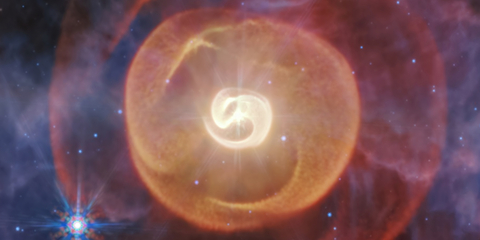 Космический телескоп «Джеймс Уэбб» запечатлел сложную пылевую структуру вокруг тройной системы Апоп, включающей две звезды типа Вольфа — Райе. Эти крайне горячие и нестабильные светила выбрасывают мощные потоки частиц, формируя спиральные оболочки.