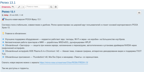 25 ноября 2025 года состоялся релиз дистрибутива ROSA Fresh 13.1 (бесплатная ОС «РОСА Фреш) от «НТЦ ИТ Роса» на базе платформы Rosa 13.
