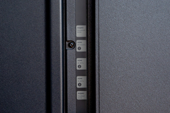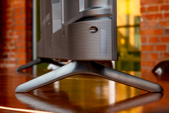 Блок управления с микрофонами и светодиодом (для индикации, когда телевизор вас слушает, индикации изменения уровня громкости и т.д.) расположен снизу дисплея. В принципе, чо бы и нет — вид не портит. На обратной стороне этого блока есть кнопка включения телика и физический переключатель микрофонов (ну, если вам телик приглянулся, но вы не хотите, чтобы он вас слушал и отзывался на вашу речь, а хотите по-дедовски голосом телику диктовать команды по нажатию с пульта, либо вообще голосом ничего ему не диктовать).