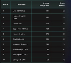 По итогам голосования лучшим смартфоном для съёмки фото с большим отрывом оказался Vivo X200 Ultra. На втором месте расположился Huawei Pura 80 Ultra, на третьем — OnePlus 13. Худшим смартфоном для создания снимков стал Samsung Galaxy S25 Ultra.