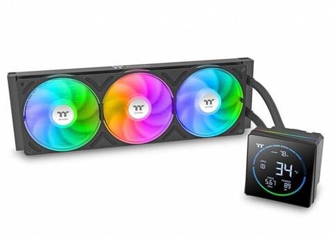 Она реализовала передачу данных на дисплей через USB-соединение с помощью фирменного программного обеспечения TT RGB Plus, которое считывает показатели ACPI системы. Экран обрамлен яркой ARGB-лентой, создающей эффектную подсветку вокруг процессорного разъема. Комплектные 120-мм вентиляторы также оснащены адресуемой подсветкой, которая полностью синхронизируется с помпой через ту же утилиту управления.