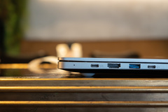 Портов много, на них экономить не стали. На левой грани ноутбука выведены основные порты для стационарного подключения: USB-C (Power Delivery) с индикатором питания полноразмерный HDMI, один скоростной USB-A и второй универсальный USB-C; правая сторона загружена периферийными интерфейсами, включая картридер MicroSD, физический переключатель блокировки камеры, аудиоразъем 3.5 мм, еще два порта USB-A и слот замка Kensington. В сумме конфигурация из трех USB-A и двух USB-C обеспечивает полную независимость от переходников (ну, разве что для вывода изображения на дополнительные мониторы придется обзавестись HDMI-донглом).