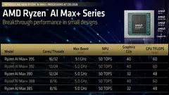 p.s. Ещё одной любопытной частью презентации стала премьера сразу двух новых моделей процессоров для линейки Ryzen AI 300 относящихся к самым старшим Ryzen AI Max. Эти чипы — Ryzen AI Max+ 388 и Ryzen AI Max+ 392 содержат уменьшенное число ядер/поток — 8/16 и 12/24, но при этом несут мощнейшее встроенное видеоядро Radeon 8060S, ранее доступное только флагману Ryzen AI Max+ 395(16 ядер/32 потока). В теории, сниженное число вычислительных блоков уменьшит выделяемый теплопакет и перед производителями появится возможность создавать компактные устройства с iGPU уровня GeForce RTX 4060 Ti.