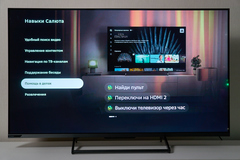 Телевизор TCL работает на операционной системе Google TV (по сути, это тот же Android TV, только поздней версии с новым) и у него тоже есть голосовой помощник, но он не такой продвинутый и умный, как Салют/GigaChat от Sber или Алиса от Яндекса. Как ни странно, каких-то преимуществ при отказе от новых моделей телевизоров с голосовыми управлением в пользу более классических, вы не получаете ни по части процессора, ни по части дисплея (TCL с уходом Samsung и LG по ценам скромничать перестали). Из плюсов: есть поддержка Dolby Vision и HDR10+ с HLG, а не только базового HDR10, но при максимальной яркости в 350 кд/м2 в этом всё равно нет смысла — для полноценной расширенной цветопередачи в HDR нужны как минимум в два раза более дорогие телевизоры.