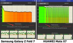 Процессор в рабочей нагрузке… не быстрее! Это было прогнозируемо, что засунутый маркетологами Snapdragon 8 Elite в сверхтонкий складной смартфон будет перегреваться как мразь, но теперь есть наглядное подтверждение: GSMArena протестировали оба смартфона в часовой нагрузке. Я изначально собирался в этом абзаце писать, что Самсунг быстрее, чем HUAWEI, даже с учётом перегрева и потери производительности, но в долгосроке ситуация выглядит вот так: