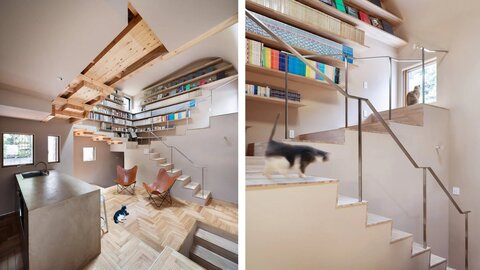Лестница спроектирована с 23 различными уровнями пола, вдохновленными размерами тела кошек. Такая конструкция помогает контролировать температуру в доме, а еще упрощает кошкам передвижение.