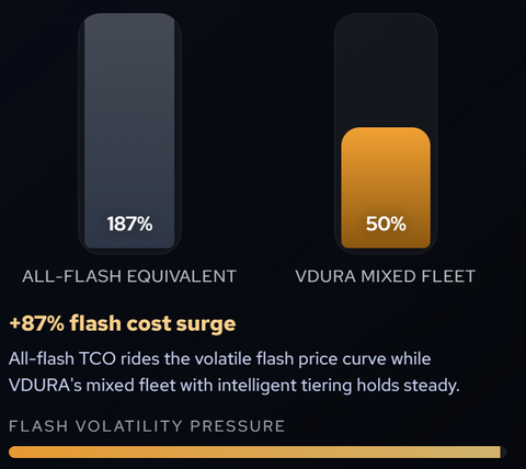 VDURA, заявившая, что теперь SSD корпоративного класса уже в 16 раз дороже HDD аналогичной ёмкости, анонсировала программу Flash Relief Program, в рамках которой клиенты получат доступ к хранилищам, по ёмкости и быстродействию не уступающие массивам VAST Data и WEKA, но вполовину дешевле с точки зрения TCO. В условиях дефицита NAND-памяти цены на SSD выросли в два-три раза, а гибридная архитектура VDURA, использующая накопители разных типов, обеспечивает превосходную производительность и ёмкость при вдвое меньшей стоимости, заявила компания.