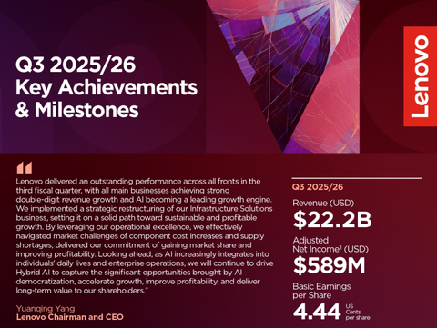 Выручка Lenovo в отчётном квартале, закончившемся 31 декабря 2025 года, достигла рекордного уровня в $22,2 млрд США, что на 18 % больше, чем годом ранее, и выше прогноза Уолл-стрит в размере $20,6 млрд (по данным Reuters). При этом выручка всех бизнес-групп выросла на двузначное число в процентах в годовом исчислении. Чистая прибыль компании снизилась на 21 % в годовом исчислении до $546 млн, что выше средней оценки аналитиков в $451,29 млн, согласно данным LSEG. Вместе с тем скорректированная чистая прибыль (Non-HKFRS) выросла на 36 % до $589 млн.