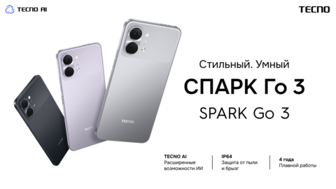 Компания TECNO начала продажи в России новой модели начального уровня SPARK Go 3. Устройство оснащено 6,75-дюймовым экраном с адаптивной частотой обновления до 120 Гц. В основе аппарата — процессор Unisoc T7250. Аккумулятор ёмкостью 5000 мАч поддерживает быструю зарядку мощностью 15 Вт. Производитель заявляет, что после четырёх лет использования батарея сохранит не менее 80 процентов исходной ёмкости. Корпус защищён по стандарту IP64 от пыли и брызг. Устройство также прошло тесты на устойчивость к падениям с высоты до 1,2 метра. Основная камера имеет разрешение 13 МП. В ней реализованы режимы съёмки с захватом движения и автоматический спуск затвора при прыжке или резком движении. Сенсорный слой экрана сохраняет чувствительность при касании мокрыми пальцами.