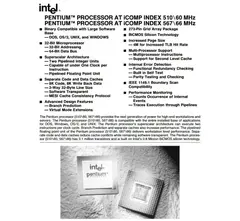 Первые вышедшие 22 марта 1993 года Pentium 60Mhz и Pentium 66Mhz стали по настоящему революционными изделиями. Во первых они были суперскалярными, то есть могли выполнять несколько инструкций за такт, что кратно увеличивало их производительность. Во вторых чипы выпускались по новейшему на тот момент 800нм техпроцессу и несли в себе сразу 3,1 миллион транзисторов. Такая начинка даже не смотря на низкие частоты работала на порядок быстрее 486х. В третьим важнейшим моментом оказался интегрированный мощный математический сопроцессор(именно поэтому DOOM даже на Pentium 60Mhz шёл гораздо лучше, чем на том же 486 DX4-100Mhz). Ну и в четвёртых новые CPU поддерживали 64х — битную шину PCI(32 бита на вход +32 бита на выход), что резко увеличивало производительность видеокарт и прочей периферии относительно используемых ранее 32х бит.