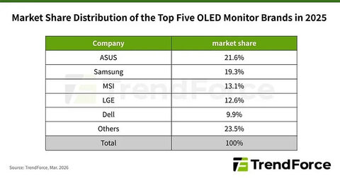 Мировые поставки OLED-мониторов показали резкий рост по итогам 2025 года. Согласно отчёту аналитической компании TrendForce, объём отгрузок увеличился на 92% за год, достигнув отметки в 2,735 миллиона устройств. Лидером глобального рынка стала компания ASUS, сумевшая обойти своих главных конкурентов. Аналитики прогнозируют, что позитивная динамика сохранится и в 2026 году поставки вырастут еще на 51%.