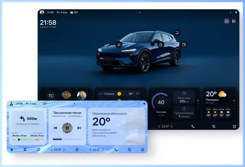 Кроме того, сверху над этими панелями имеется строка состояния со временем, датой и погодой, а снизу размещены элементы управления климатом и иными функциями авто. Здесь хотелось бы отметить, что кнопки снизу, отвечающий за климат, музыку, навигацию и не только, выглядят слегка мелкими на фоне довольно крупных панелей с погодой и контактами. При этом второе изображение указывает на то, что окна на главном экране можно будет настраивать — например, выводить навигационные подсказки, музыкальный плеер и, опять же, прогноз погоды. Изображение: Autonews, «Открытая мобильная платформа»