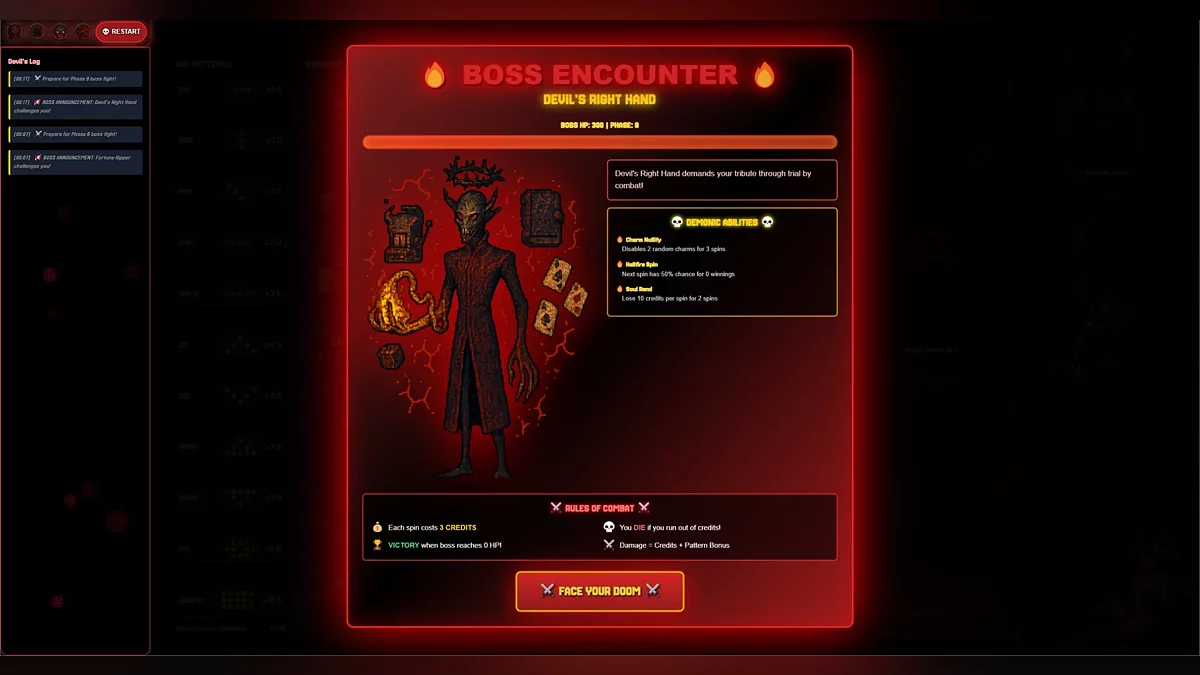 Devils Due — это ролевая игра с боевой системой, основанной на слот-механике, где игрок сражается с демоническими боссами, управляя риском и ресурсами в условиях долгов перед Дьяволом. Победа в бою зависит от результатов вращений, которые определяют наносимый урон и могут как усилить, так и обернуть успех против игрока.