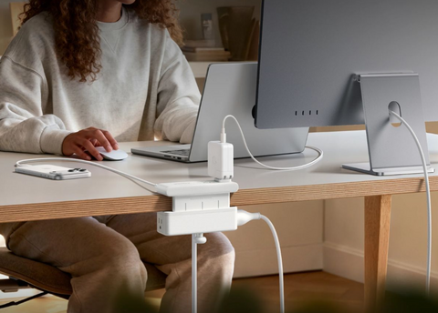 Модель крепится к краю столешницы с помощью регулировочного винта, что позволяет надежно зафиксировать корпус. Устойчивость конструкции дает возможность отключать кабели одной рукой, не придерживая устройство. Зажим совместим с поверхностями толщиной от 12 до 45 мм. Благодаря использованию технологии GaN, производителю удалось сохранить компактные размеры при значительном количестве доступных портов.