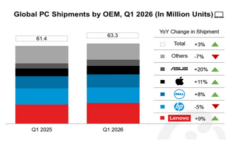 Мировой рынок компьютеров показал подъем в первом квартале 2026 года. По предварительным расчетам, объем отгрузок вырос на 3.2% и составил 63.3 млн единиц. Основными причинами такой динамики стали закупки в ожидании подорожания памяти, а также плановое обновление парка техники из-за прекращения поддержки Windows 10. В текущих условиях стабильность бизнеса зависит от надежности цепочек поставок и постепенного перехода к реализации моделей среднего и высокого ценового сегмента.