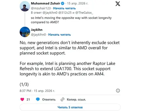 Инсайдер под ником Jaykihn, отвечая на риторический вопрос другого пользователя о том, будет ли Intel когда — нибудь также как и AMD выпускать много поколений под один сокет, поведал о планах компании выпустить ещё одну линейку чипов для платформы LGA1700. Якобы перспективные CPU вновь станут производиться по 10нм техпроцессу(чипмейкер называет его Intel 7) и окажутся новым переизданием серии Raptor Lake(Raptor Lake — 13е поколение процессоров Core, Raptor Lake Refresh — 14е).