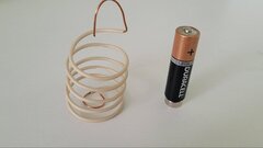 Прикрепляем магнит к минусовому контакту батарейки и помещаем получившуюся конструкцию в центр пружинки таким образом, чтобы кольцо обхватывало магнит с небольшим зазором. С этим, возможно, придется немного повозиться. Верхний конец проволоки аккуратно загибаем и опускаем на плюсовой контакт батарейки.