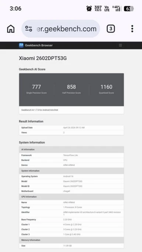 Базовая модель Xiaomi 17T только что прошла тестирование в Geekbench AI, выдав свои характеристики с головой. По данным портала Gizmochina, в базе данных бенчмарка засветилось устройство с внутренним номером 2602DPT53G. Многочисленные сертификационные документы уже подтвердили, что именно под этим кодом скрывается будущий Xiaomi 17T. Судя по всему, компания готовит как минимум две версии — стандартную и Pro. Самой интригующей деталью теста Geekbench стал процессор. В нем указан чип MediaTek с довольно необычной архитектурой: одно супер-ядро работает на частоте 3,40 ГГц, еще три производительных ядра трудятся на частоте 3,20 ГГц, а четыре энергоэффективных ядра дополняют картину частотой 2,20 ГГц. За обработку графики отвечает видеоускоритель Mali-G720 MC8. Специалисты сходятся во мнении, что это новый чипсет MediaTek Dimensity 8500. Если информация верна, то Xiaomi 17T получит процессор, который по производительности может вплотную приблизиться к флагманским решениям, но при этом сохранит более привлекательный ценник. Протестированный образец оснащался 12 ГБ оперативной памяти и работал под управлением Android 16, поверх которого, как ожидается, будет установлена новейшая фирменная оболочка HyperOS 3.