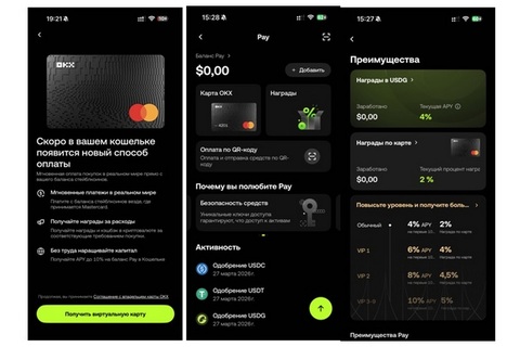 Карта выпускается в виртуальном формате и сразу доступна для добавления в Apple Pay или Google Pay — можно платить смартфоном. Выпуск и пополнение происходит через кошелек OKX Pay в стейблкоинах USDT, USDC или USDG. В момент оплаты нужная сумма автоматически конвертируется в фиат по рыночному курсу. Комиссия за саму конвертацию отсутствует, применяется только рыночный спред — порядка 0,4%. Для сравнения: традиционные банки при трансграничных платежах берут от 1,5% до 3% за FX-операцию.