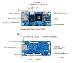 Итак, Orange Pi Zero 3W — очень интересная платка. Обладающая классическими габаритами Zero устройств — 65*32мм, она включает в себя весь необходимый инструментарий необходимый пользователю ПК. Площадка разъёмов GPIO, mini-HDMI, 2* USB Type-C порта(где первый идёт под питание, а второй под разветвитель и устройства ввода/вывода с поддержкой USB3.1), Bluetooth5/Wi-Fi6 приёмник для высокоскоростной беспроводной связи, ридер SD-карт, четыре шлейфовых подключения под периферию камер, дисплея и даже шины PCI 3.0(!!!), всё это кажется просто «королевским» набором для создания мощного «умного дома» или иных сложных компактных устройств. Но все эти «бонусы» Pi Zero 3W просто меркнут по сравнению с мощнейшей для его габаритов аппаратной начинкой — восьмиядерным Arm процессором Allwinner A733(2*Cortex-A76 2.0Ghz, 6*Cortex-A55 + 1*RISC — ядро для запуска профильных приложений) с мощной графикой PowerVR BXM-4-64 и даже нейропроцессором в 3TOPS, оперативной памятью LPDDR5 объёмом до 16Гб и возможностью установки твердотельных чипов — накопителей eMMC/UFS до 128Гб.
